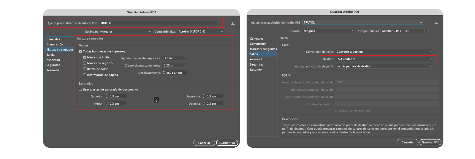 3- Ya solo queda exportar el archivo con los ajustes PDF preestablecidos de Truyol, y el perfil de color FOGRA PSO COATED V3 para imprimir en CMYK.