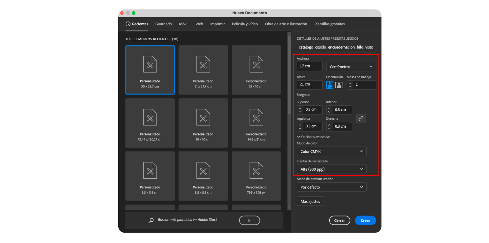- Selecciona el modo de color CMYK, e indica una resolución de 300 ppp y 3 mm de sangrado perimetral.