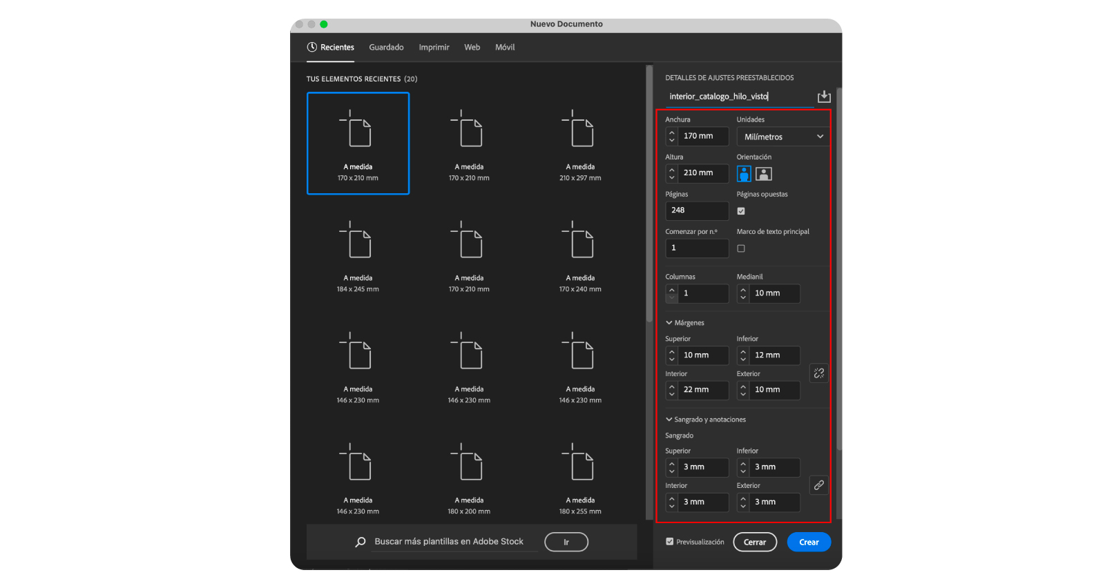 1- Abre un nuevo documento en InDesign y configúralo con los valores de tu libro o catálogo: